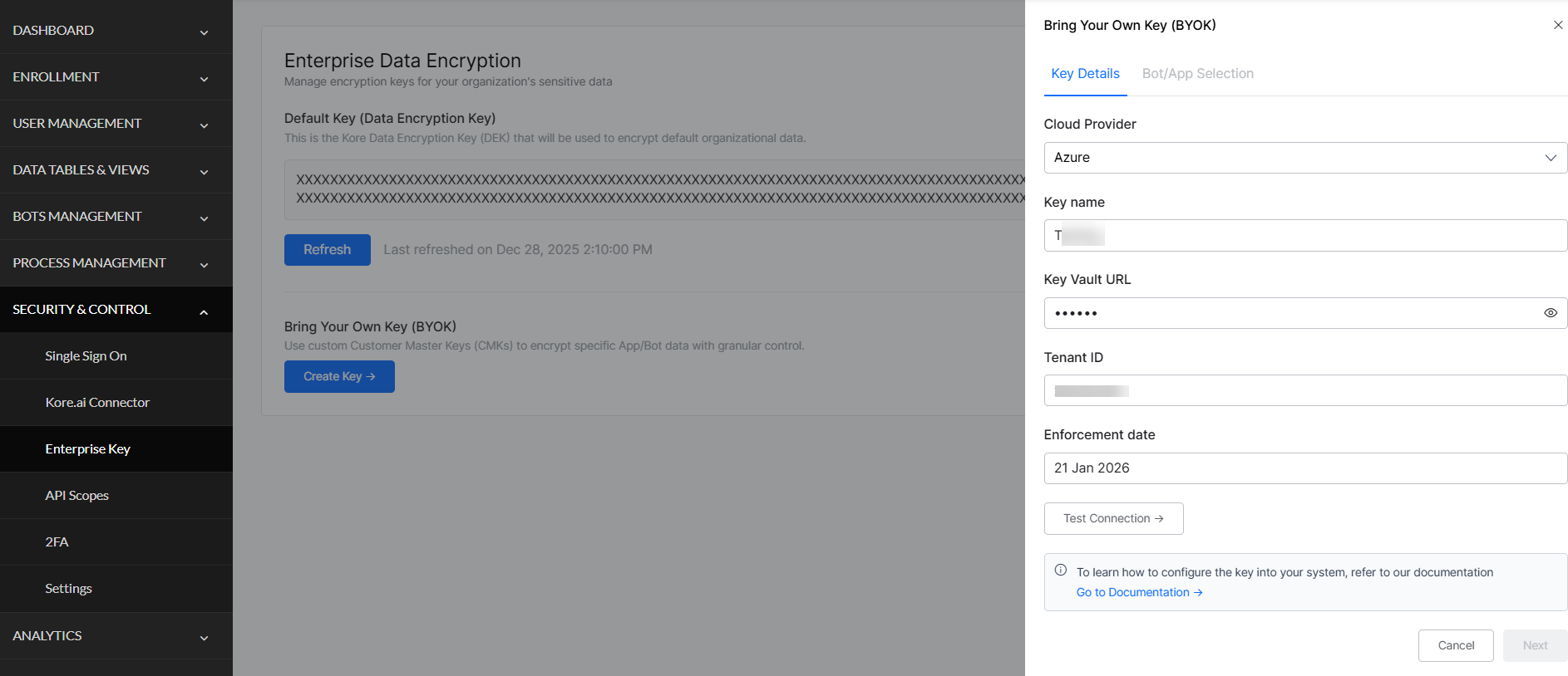 - Share Information: Share your Tenant ID, Key Vault URI, and Key Name with Kore.ai to complete the integration and approve network access.