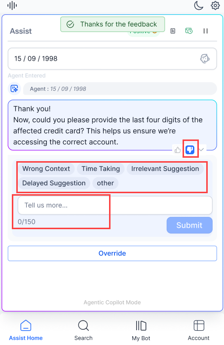 The following screenshot shows the list of Agentic Feedback messages that appear when an agent clicks the thumbs-down icon. Agents can select multiple feedback messages and also enter a comment in the Tell us more… field (if you select Display additional comment box during configuration).