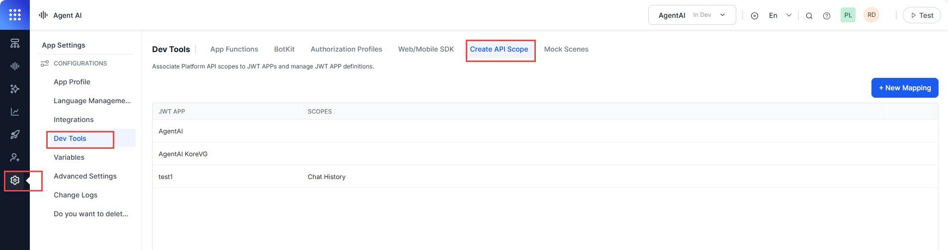 Go to App Settings, and select Configurations > Dev Tools > API Scopes.