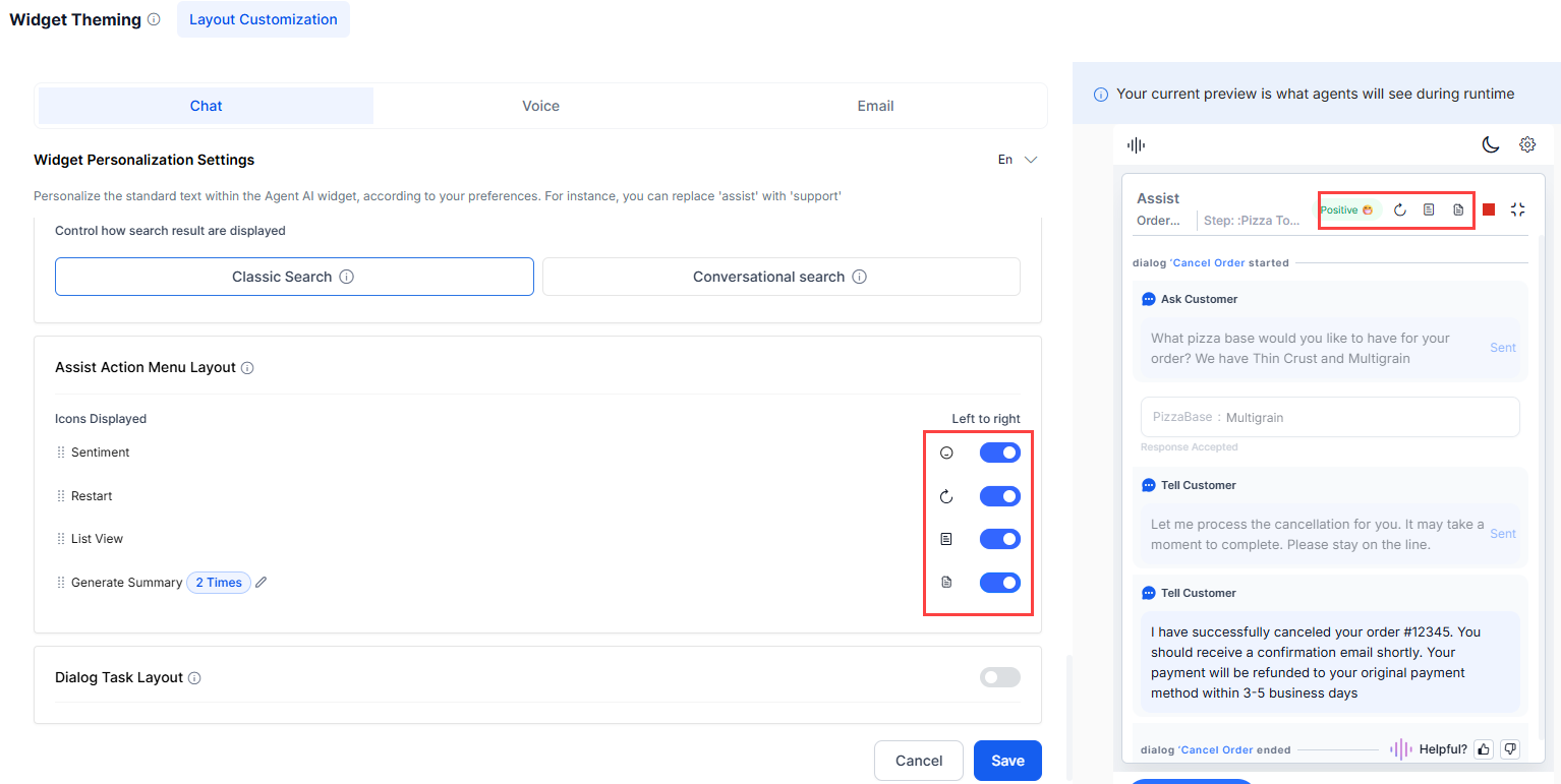 Agent AI now enables channel-specific widget customization, letting users modify the widget's layout as required. As you customize the widget, you can preview the changes on the right half of the page.
