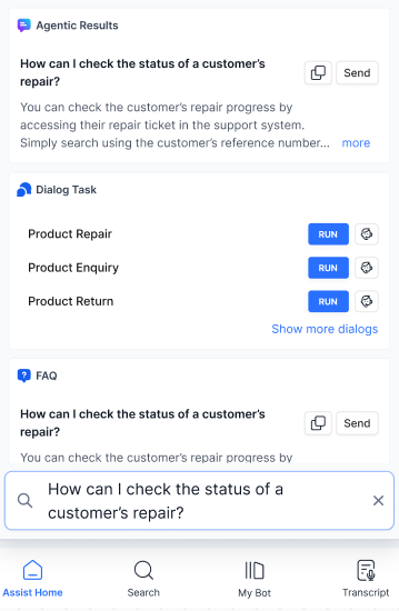 Conversational Search: Displays a history of previous questions and answers. Agents can refer to earlier results and ask followup questions, reducing repetition and improving context.
