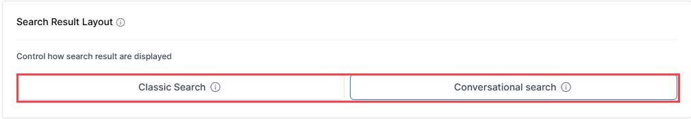 This section lets you control how search results appear in the widget. You can use Classic Search (default) that shows only the current search results or Conversational Search to provide more contextual results.