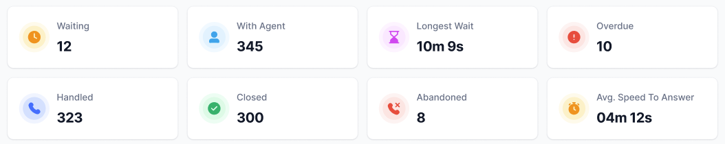 Name Live/Time based Description Waiting Live Count of all conversations waiting in all queues. With Agent Live Count of all conversations currently with Agents. Longest Wait Live Duration of the longest wait of any conversation currently in a waiting state. Overdue Live Count of all conversations currently overdue with Agents. Handled Time-based Count of all conversations handled (completed) by the contact center. Closed Time-based Count of all conversations closed properly by agents at the contact center. Abandoned Time-based Count of all conversations abandoned by users in queues. Avg. Speed To Answer (ASA) Time-based ASA of all conversations. -