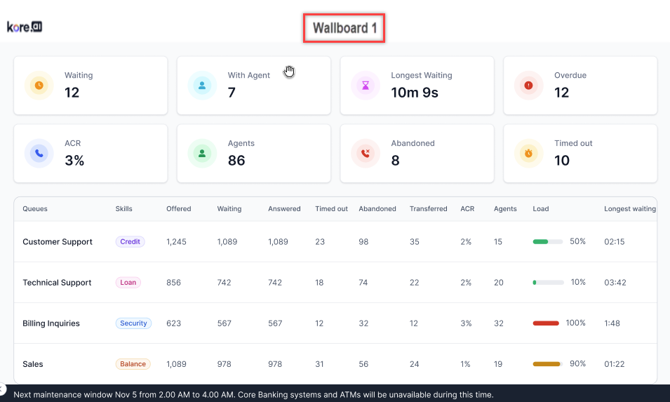 The following widgets on the wallboard show data related to the KPIs of the contact center for the configured time duration.