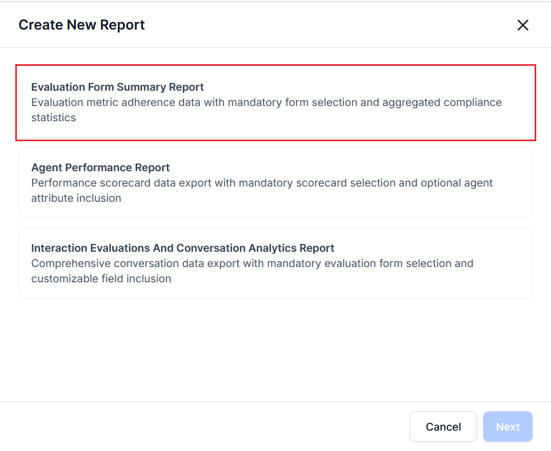 Select the required Evaluation Form or Agent Scorecard (as applicable) to determine the data scope and relevant interactions.