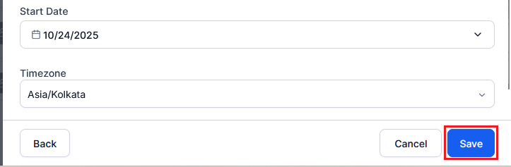 Modify Run on Demand or Schedule with the desired frequency details, such as Hourly, Daily, Weekly, Monthly, Quarterly, Yearly, Start Date, and Time Zone.