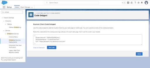 In the Quick Find search bar on the left panel, type Embedded Service Deployments and select it. Select the Messaging Channel and then select Code Snippet.