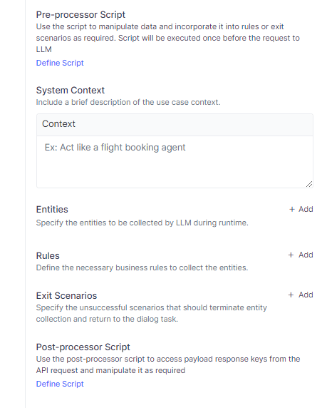 - System Context, Business Rules, and Exit Scenarios: The Agent Node incorporates system context, business rules, and predefined exit scenarios to ensure accurate and relevant responses. This contextual intelligence helps guide the conversation, handle various user inputs effectively, and maintain alignment with enterprise business rules.