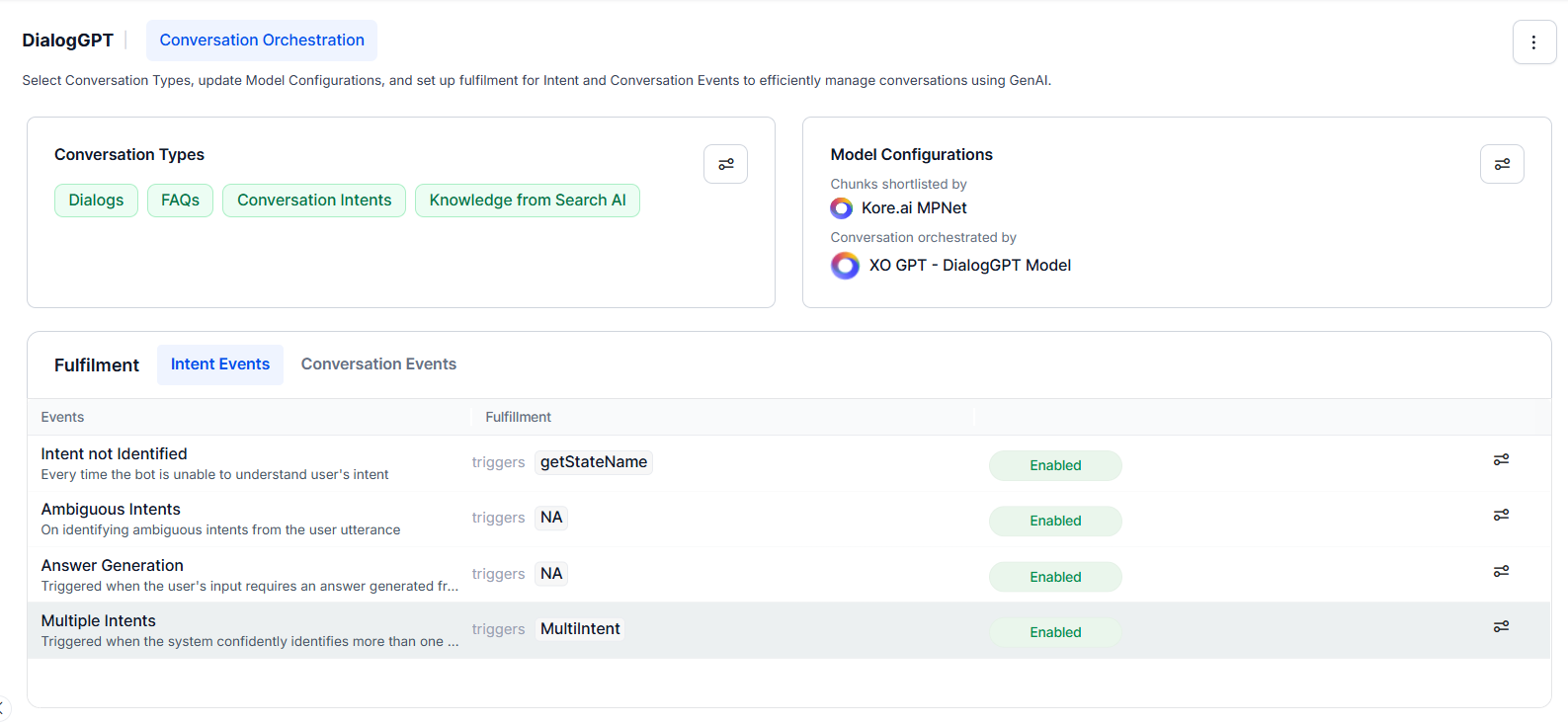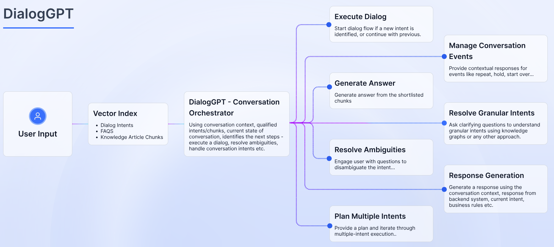 DialogGPT is an agentic orchestrator, managing the entire conversation flow from intent identification to fulfillment. It enhances intent detection and conversation handling with zero training.