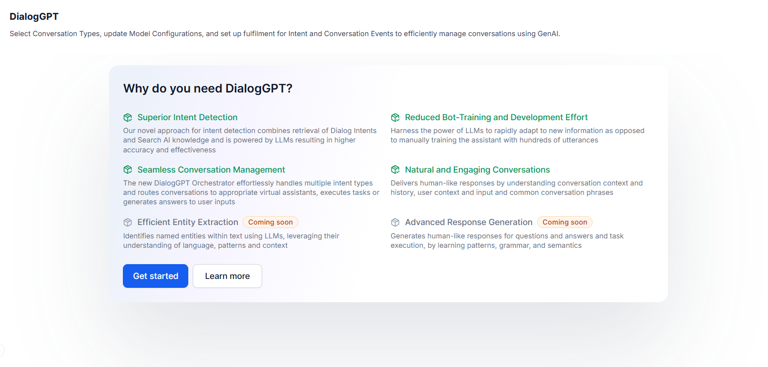 - Click Enable DialogGPT. The DialogGPT home page is displayed.