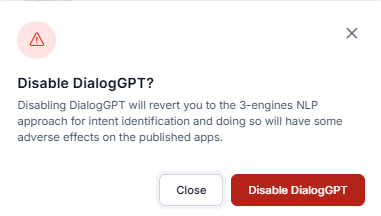 To disable DialogGPT, click the More icon (three dots) in the top right corner and then click Disable DialogGPT. The Disable DialogGPT pop-up is displayed.