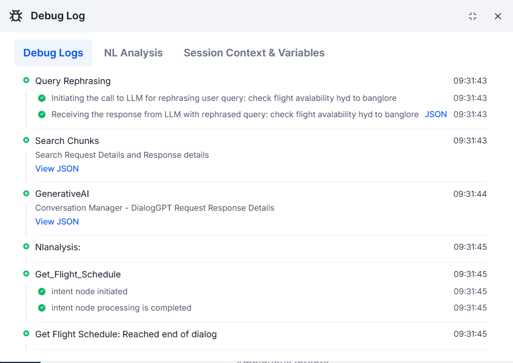 The Debug Logs offer detailed insights into the DialogGPT model's behavior and execution flow. They allow you to observe each step of the DialogGPT process and its outcomes. Logs include complete request and response details for every LLM call, clearly showing what happens at each stage. This information helps understand and analyze the DialogGPT’s decision-making and execution for better debugging and optimization.