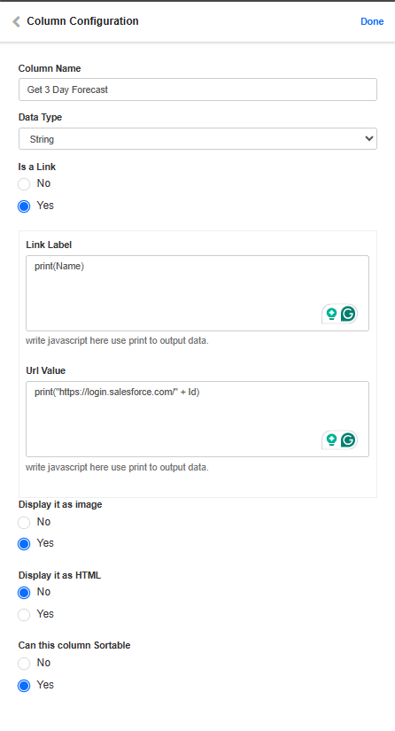Enable Is a link if the data in the column is a hyperlink. When enabled: - In the Link Label field, enter the JavaScript to display the text for the link, for example, print(Name);.