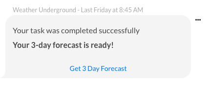 While you can configure a standard Kore.ai alert to provide an alert message to a user with, for example, a weather report for the day, or daily tide report. But what if the user wants a 3-day or 10-day forecast? That’s a lot of data to push into a single message. With the XO Platform, you can define a link in your message that can display the weather data in a formatted table that your end-user can retrieve when needed. The weather info report type can be displayed as a link in a weather alert message as shown in the following illustration for the report called Get 3 Day Forecast.