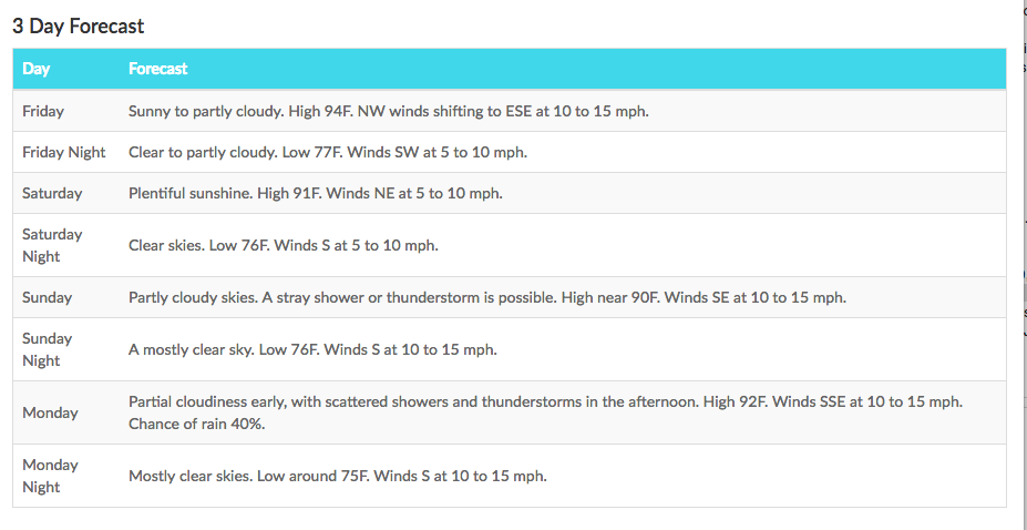 When the user clicks the link in the message, a weather report shows the data for the columns defined with a table header, optional table description, and a header row as shown in the following illustration for the 3 Day Forecast report.