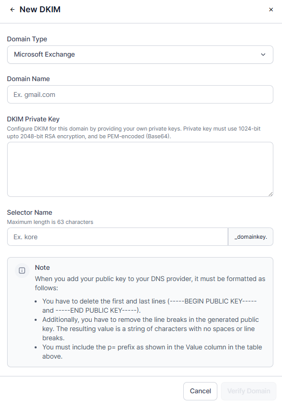 Generate and Configure DKIM for this domain by providing your own private key. The Private key must use 1024-bit to 2048-bit RSA encryption, and be PEM-encoded. Refer Generating DKIM keys using OpenSSL.