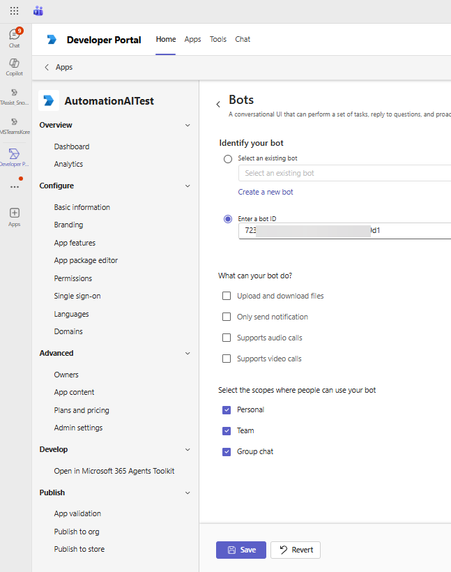 Navigate to App Features → Bot Menu and select the Enter a bot ID. Enter the Microsoft App ID. Enable all required scopes.