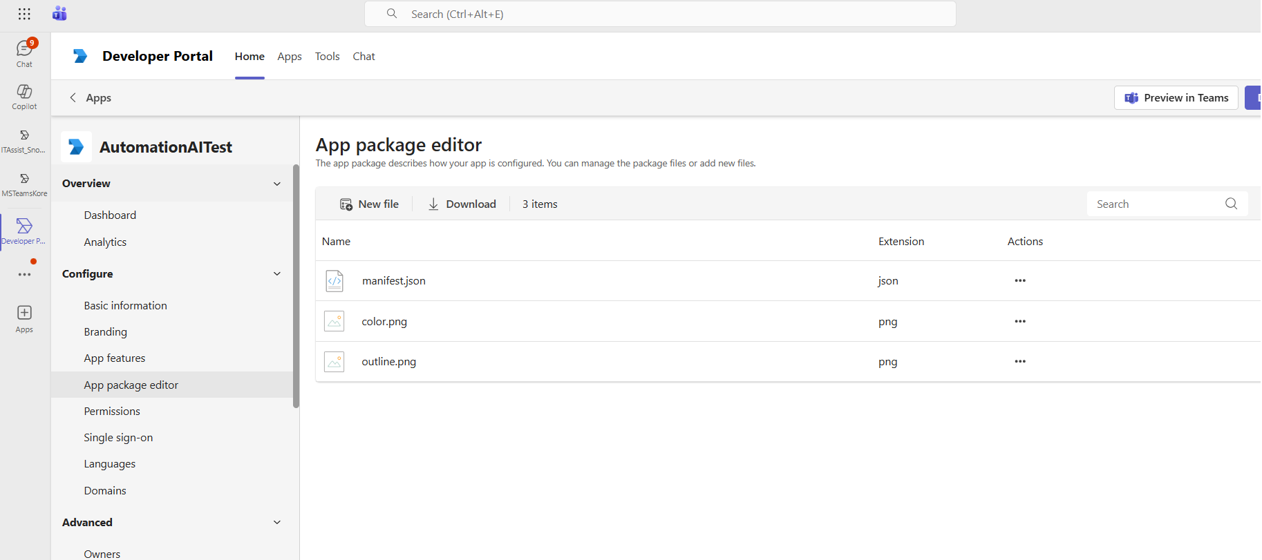 Open App Package Editor. It displays manifest.json, color.png, and outline.png. Download the ZIP package.