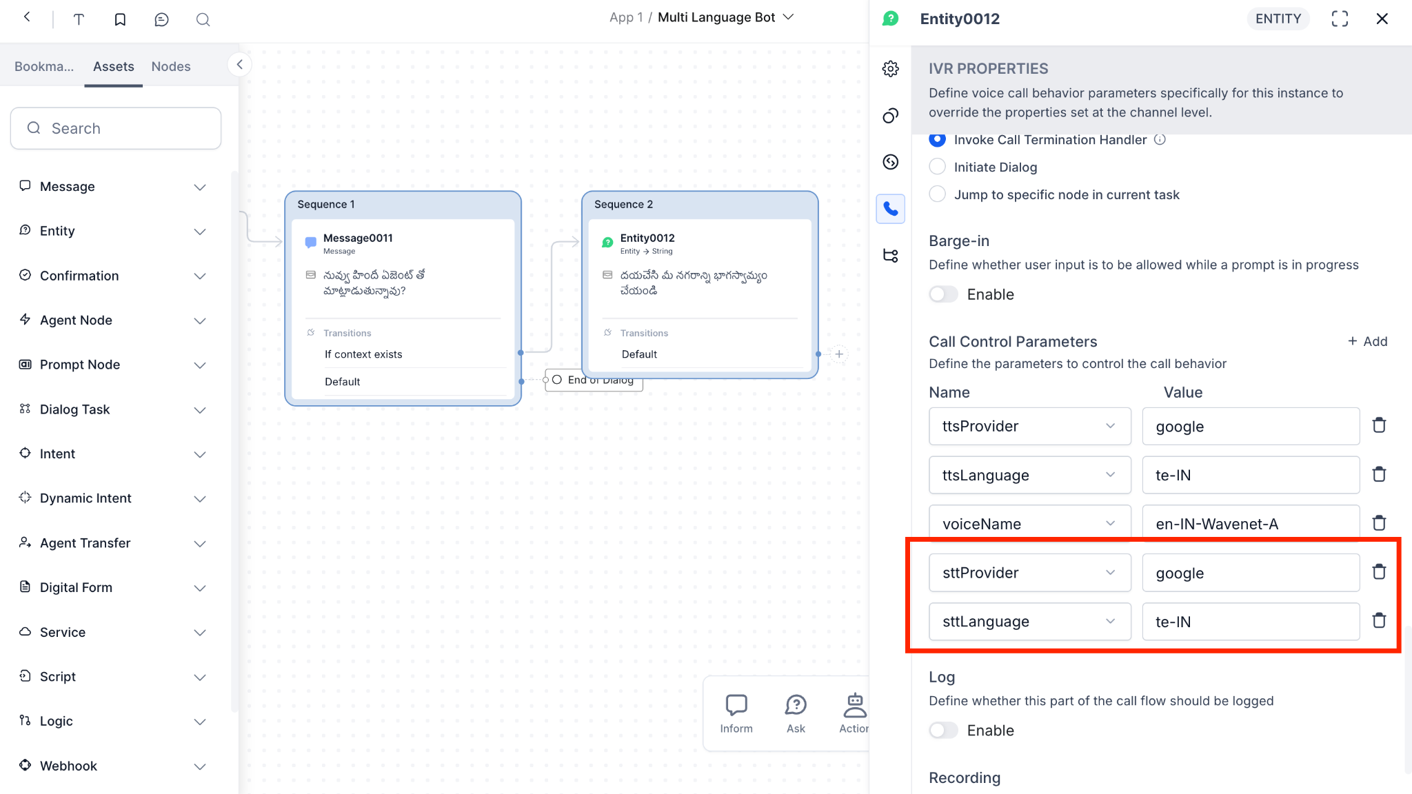 - In a specific Dialog Flow node (for example, a Message or Entity node), click the IVR Properties tab.