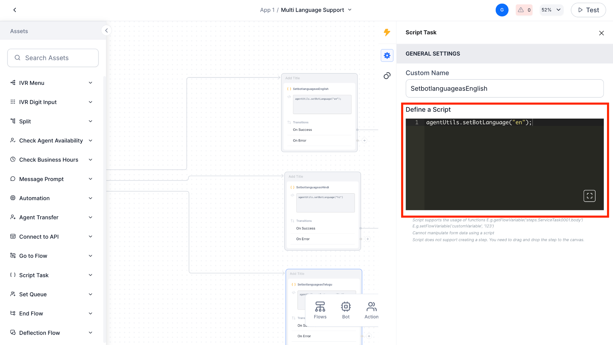 In the IVR Menu node, create prompts for each language option (for example, "Press 1 for English," "Press 2 for Hindi," "Press 3 for Telugu").