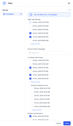- Select up to 10 campaign executions (Campaign Name: Date of Run).