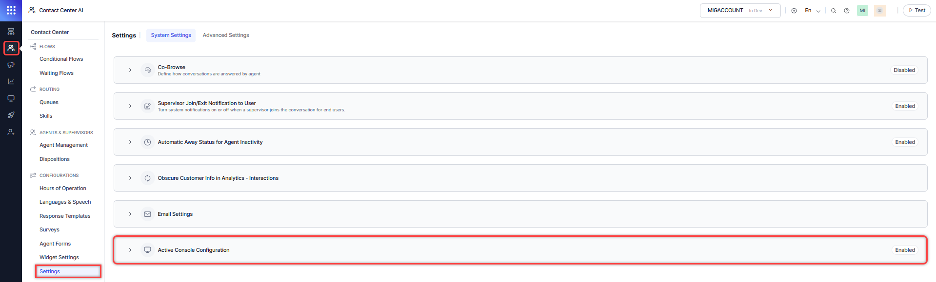 1. Go to Contact Center AI > Settings > System Settings > Active Console Configuration.