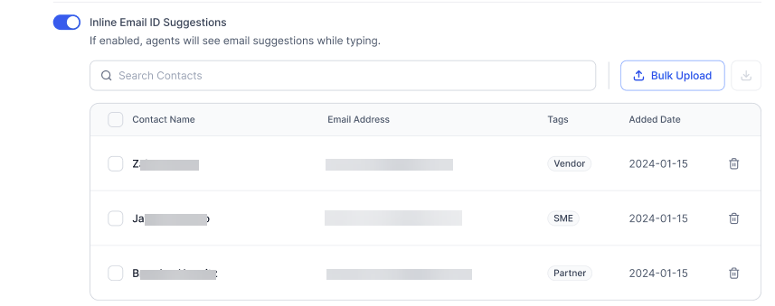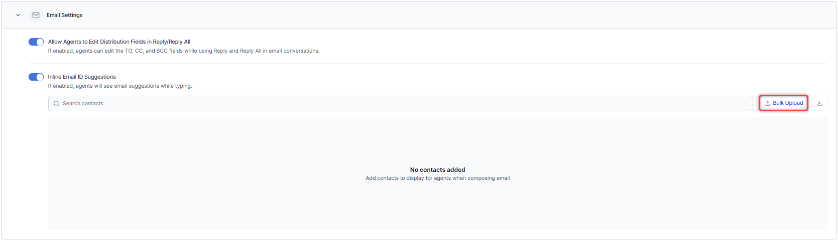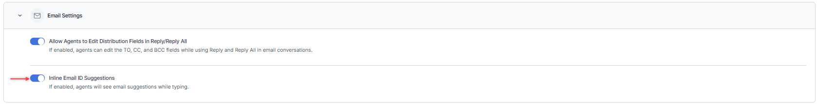 The Inline Email ID Suggestions setting displays suggestions to agents while typing.