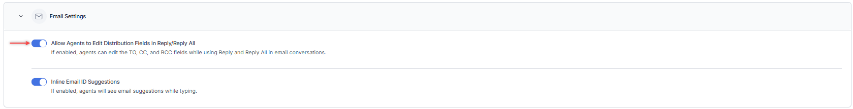 The Allow Agents to Edit Distribution Fields in Reply/Reply All setting enables agents to modify the TO, CC, and BCC fields when replying or replying all to email conversations.