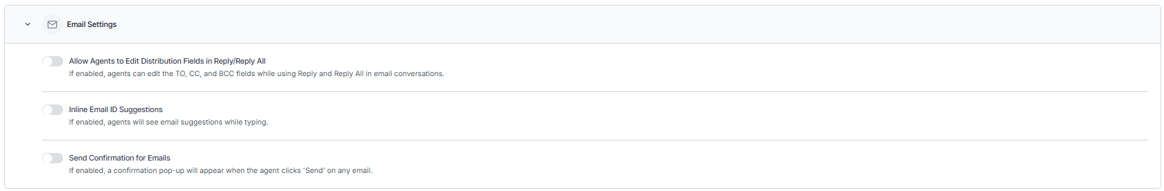 The Inline Email ID Suggestions setting displays contact suggestions while agents type.