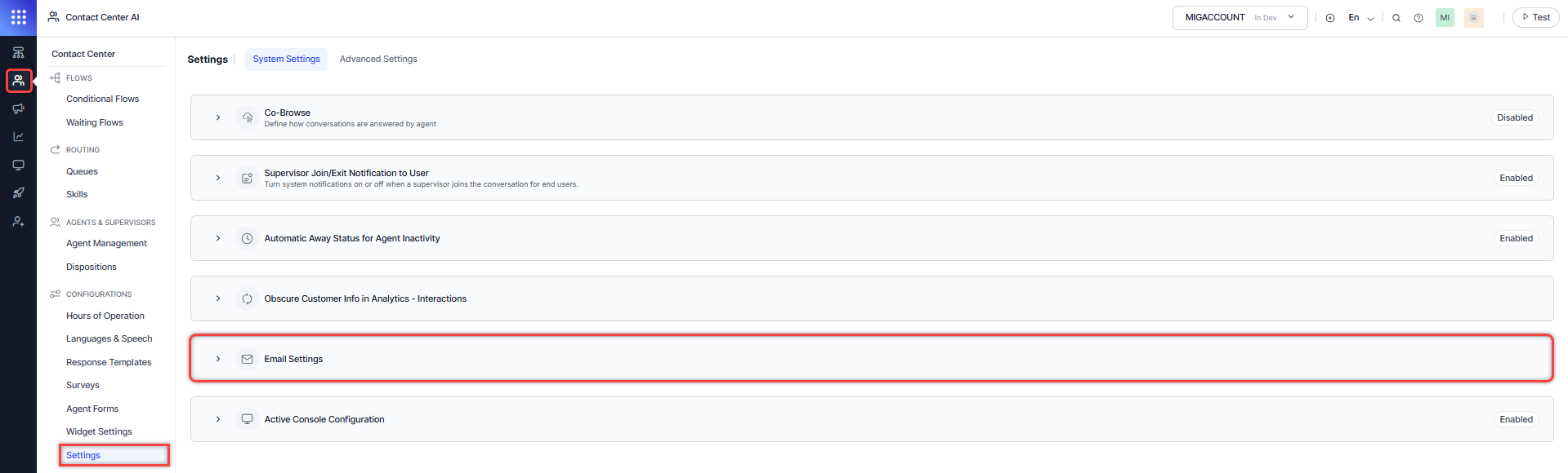 Contact Center AI > Configurations > Settings > System Settings > Email Settings.