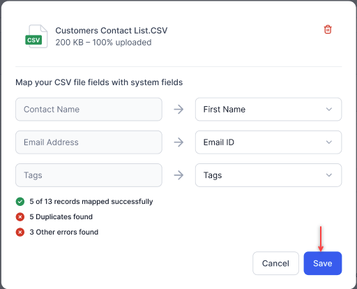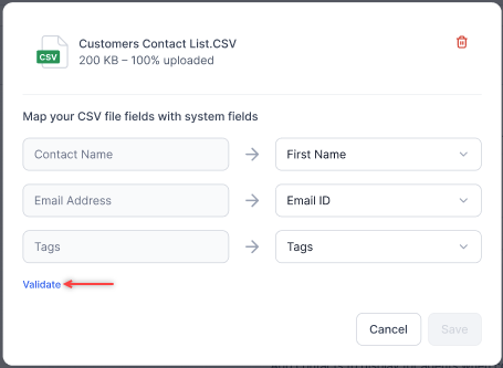 After the file is uploaded, map the CSV fields with the system fields and click Validate.