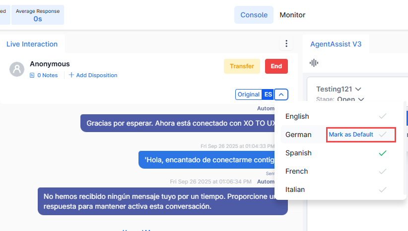 Go to Contact Center AI > Console, and select a language from the language dropdown list.