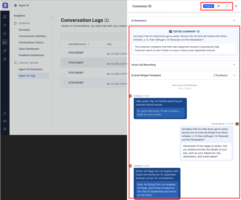 The Conversation Logs section also provides a language dropdown list. You can view content in the original language, translated language, or both side by side. You can also translate the content in another available language, if Agent AI Conversation Logs is enabled in the Contact Center AI > CONFIGURATIONS > Settings > Advanced Settings > Translation Configurations section.