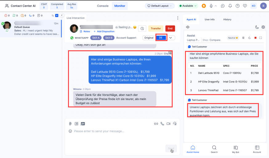 The chat messages in the console and the text-only content in the Assist, Search, and My Bot tabs get translated into the selected language.