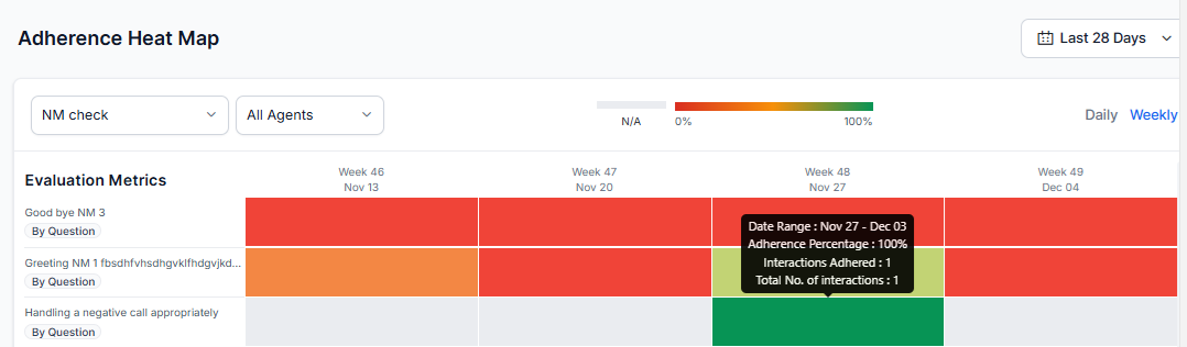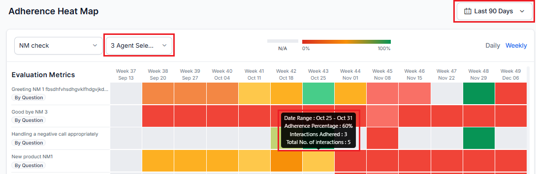 The Adherence Heatmap feature helps supervisors to track and visualize trends in agent adherence to specific metrics over time, making it easy to filter out non-compliant interactions, particularly where agents fall short of meeting set metrics. Hovering over each tile highlights the corresponding date range, total number of interactions, interactions adhered, and adherence percentages.
