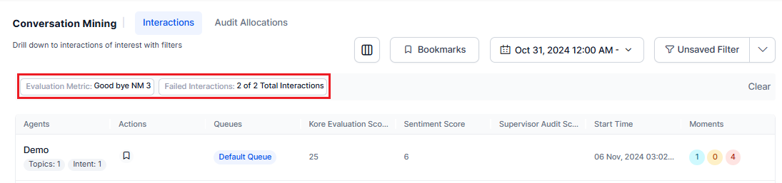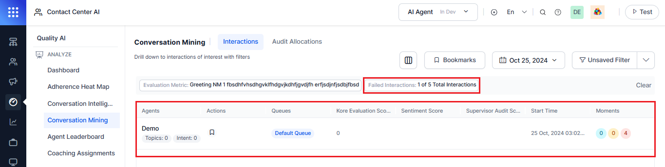 View Interactions: Click the View Interactions button, which directs you to the Conversation Mining page, where you can view failed interactions of all agents. The applied filters (as Unsaved) include the evaluation metric name or metric used with queues, and metric qualification or the number of failed interactions (pass/fail).