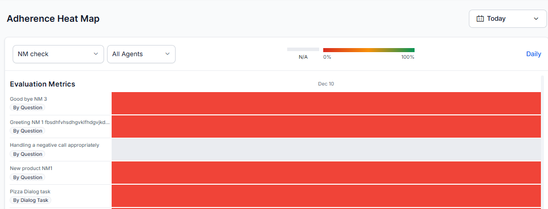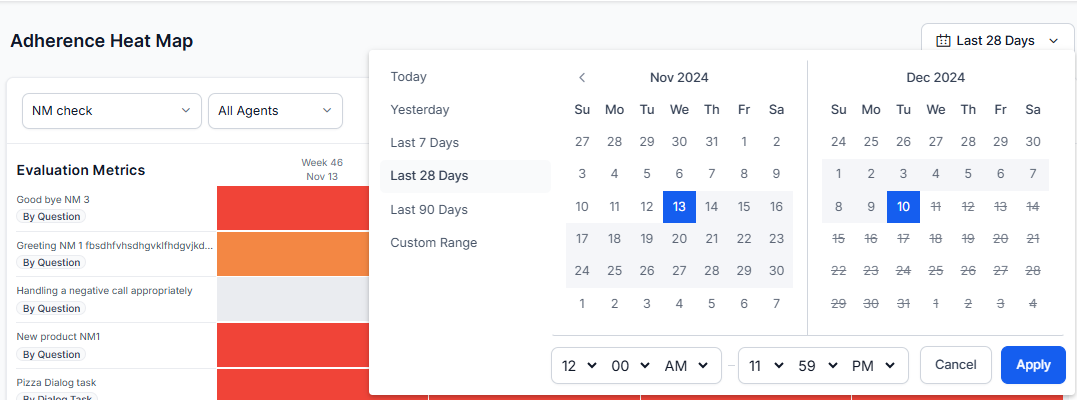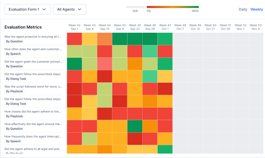 Based on the date range, agents, and language filter selection, supervisors can analyze the color-coded adherence data in the heatmap to quickly identify areas of concern, monitor agent compliance across evaluation forms in evaluation metrics or queues, and also spot agents who need special attention. This provides valuable insights, enabling supervisors to make data-driven decisions and take focused actions to improve agent performance.