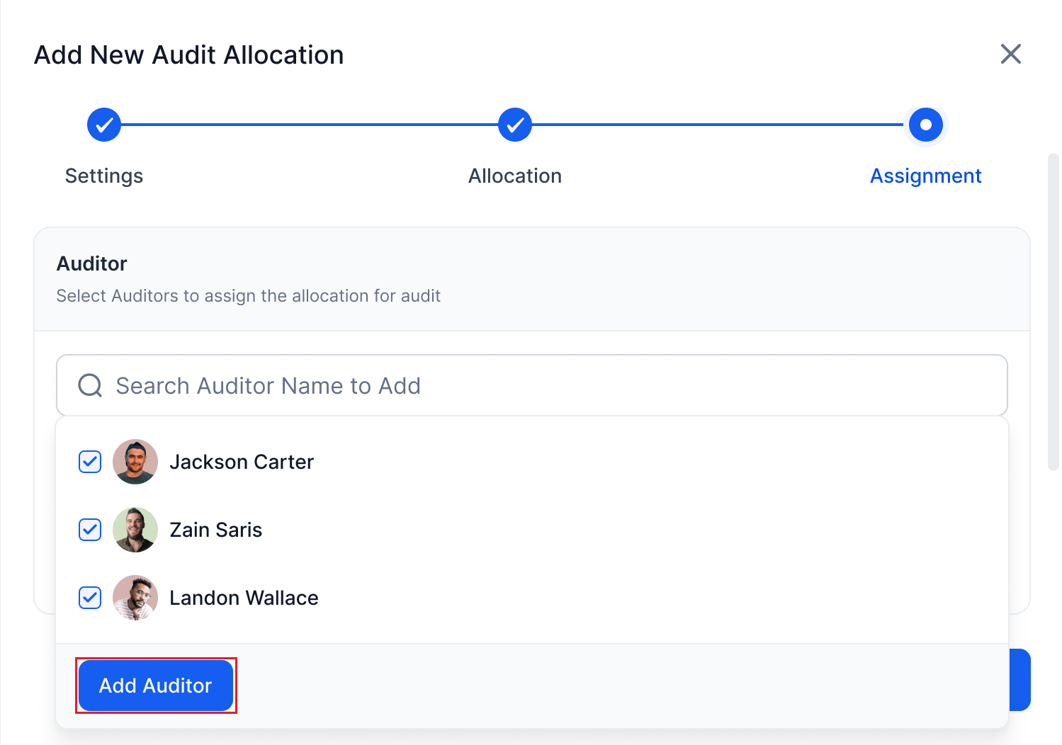 The total allocation percentage across all auditors must sum to 100% to enable the Create button.