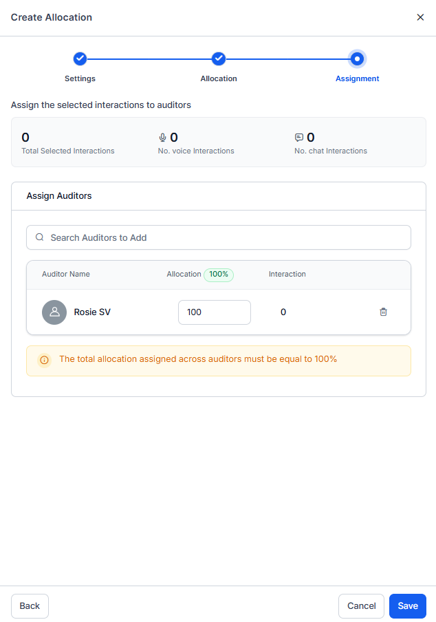 The Assignment step completes your allocation by distributing the selected interactions across your auditor team. This final configuration ensures balanced workload distribution and activates the allocation for evaluation.
