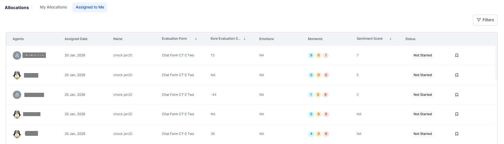The Assigned to Me tab displays all interactions that managers or supervisors have assigned to you for manual evaluation. This focused view helps you efficiently work through your audit queue while tracking your progress and organizing your evaluation work.