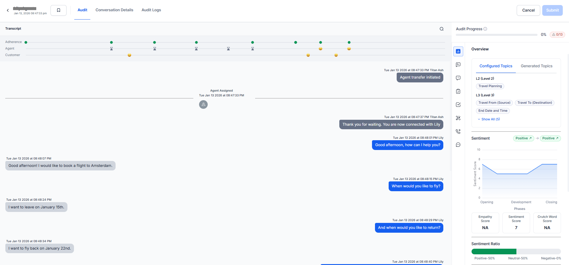 Emotions Detected customer emotions throughout the interaction (for example, frustrated, satisfied, neutral).