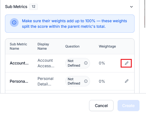 You can configure each sub-metric individually by selecting Edit next to the Weightage field. This opens a full-screen configuration panel where you can define the following: