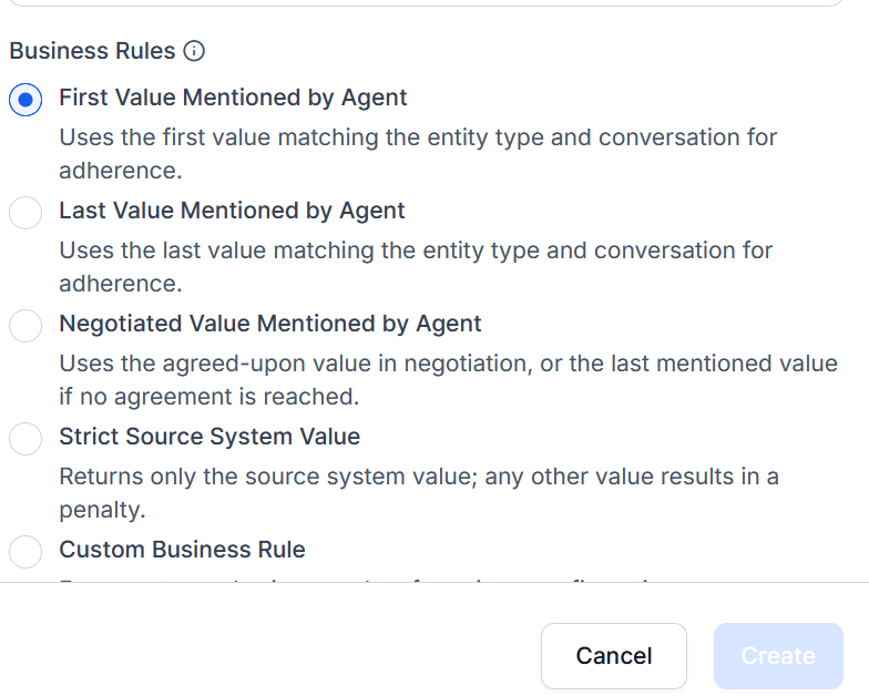 This defines how the system identifies and extracts specific values mentioned by the agent during a conversation (for example, an interest rate). These extracted values are compared with backend references to assess adherence. The configuration provides instructions to the AI on how to locate and extract these values accurately.