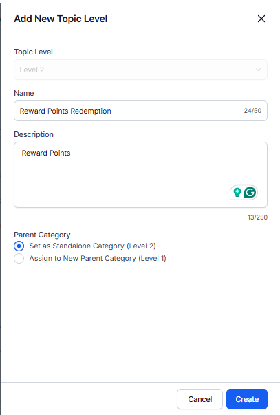 When you click from an existing L1 node, the configuration slideout preselects that L1 as the parent category. This streamlines the creation process.