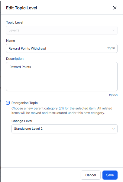 Level Changes: You can move topics between different levels (for example, L2 to L1, L2 to L3) while maintaining their child relationships.