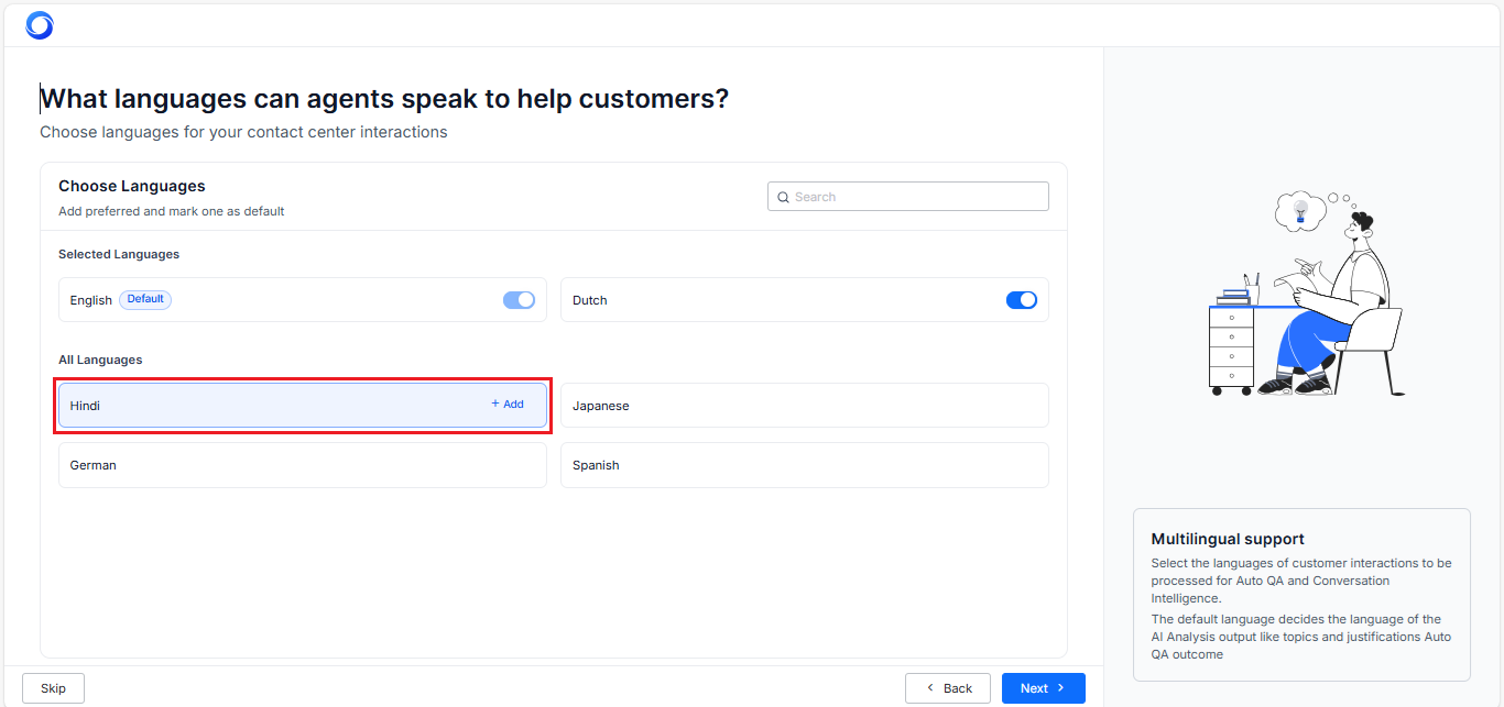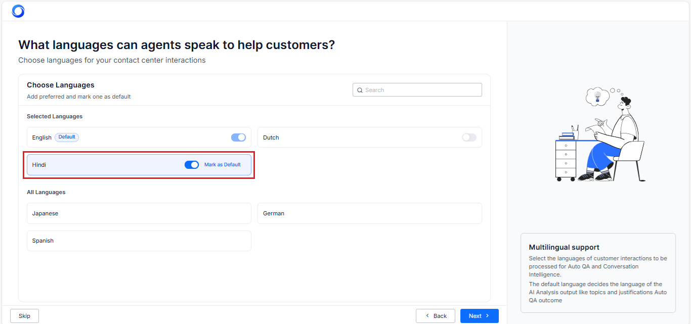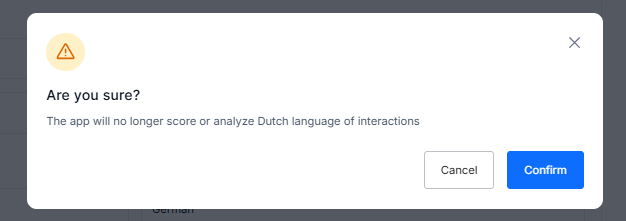 Removing the default language disables scoring and analysis for that language. Regardless of how agents or customers interact, AI‑generated insights (such as topics and names) are always shown in the selected default language.