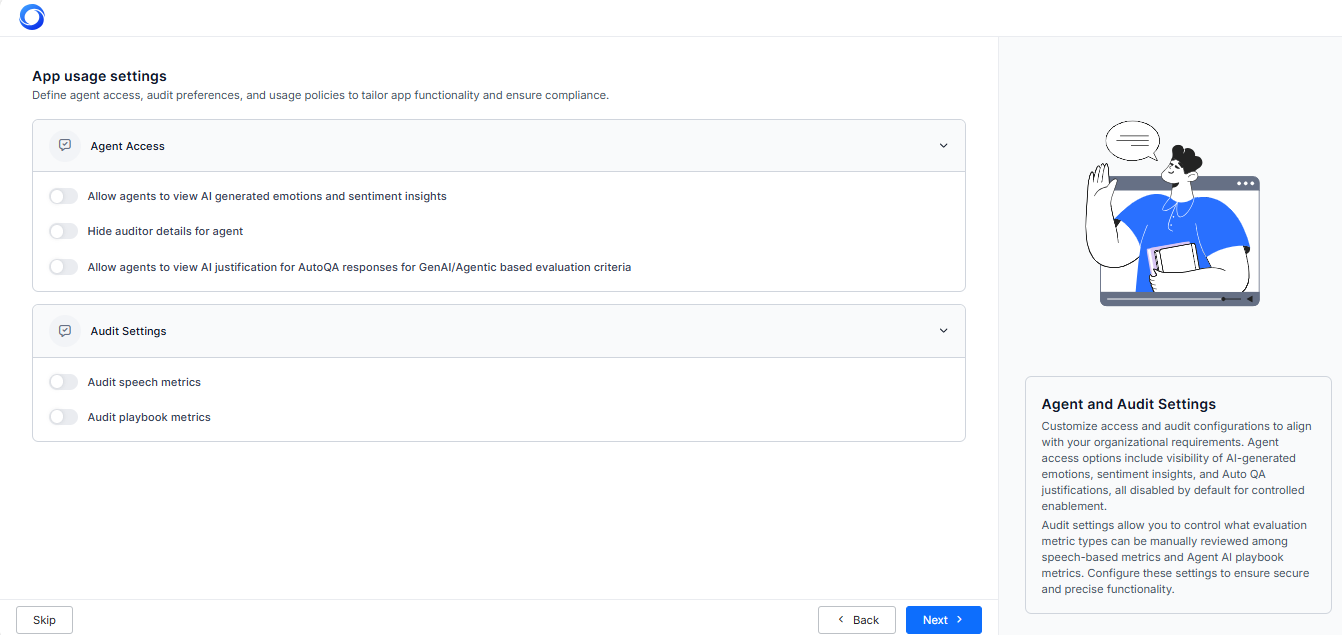 This allows you to define agent access, audit preferences, and usage policies to ensure compliance and tailor application functionality.