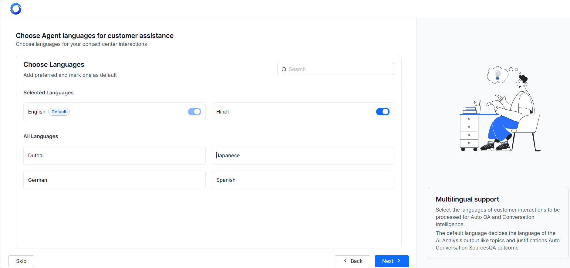 Select agent languages for customer assistance and AI-generated output (Topics, Justifications, QA outcomes).