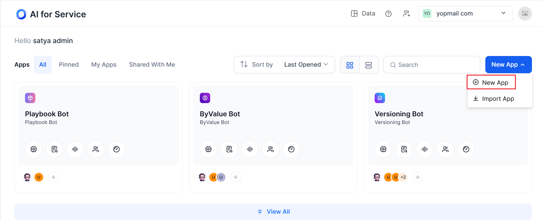 Select the New App dropdown located at the upper right corner of the XO landing page.